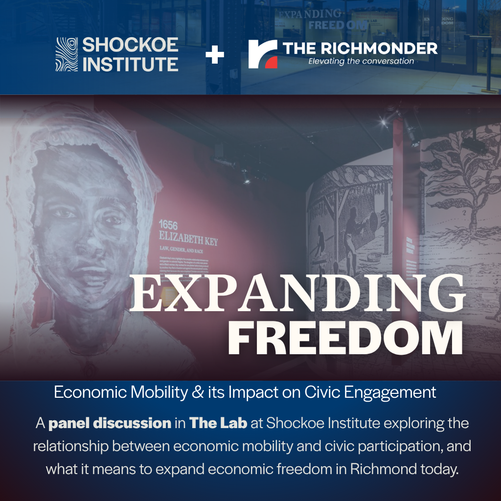 The Shockoe Institute and The Richmonder, for their first joint event, will convene a panel discussion exploring the relationship between economic mobility and civic participation, and what it means to expand economic freedom in Richmond today.